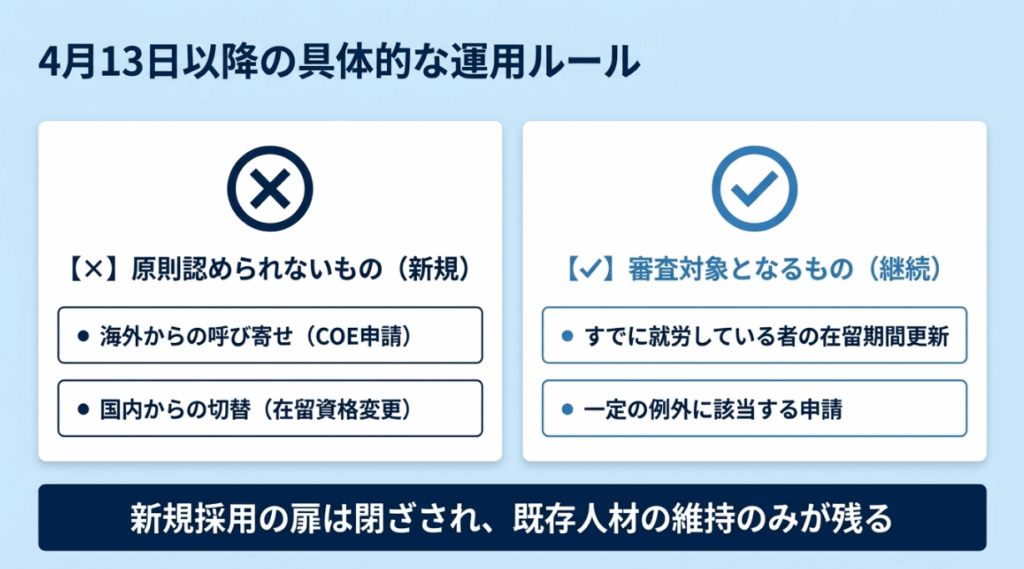具体的には、海外からの呼び寄せ(COE申請)および国内からの切替(在留資格変更)は、同日以降に受理されたものについて原則として認められない運用です。